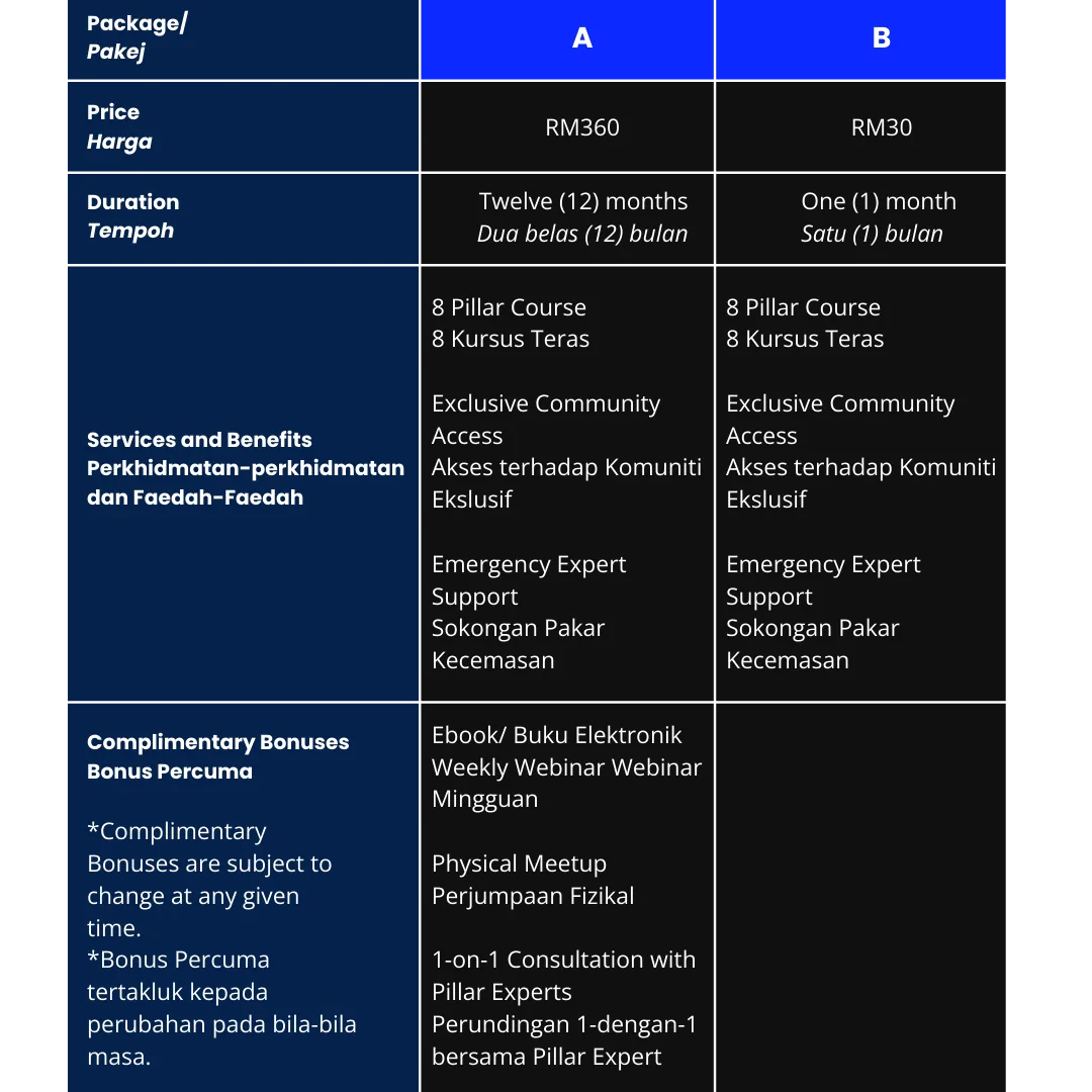 1-to-1 Consultation with Pillar Experts (only in force to users paying for this service)/ Perundingan 1-dengan-1 bersama Pillar Expert (hanya berkuat kuasa untuk pengguna yang membayar untuk perkhidmatan ini)You shall be given access to the Company’s 1-to-1 Consultation sessions with the Company’s dedicated Pillar Expert, consisting of selected employees only on a one-off basis.
